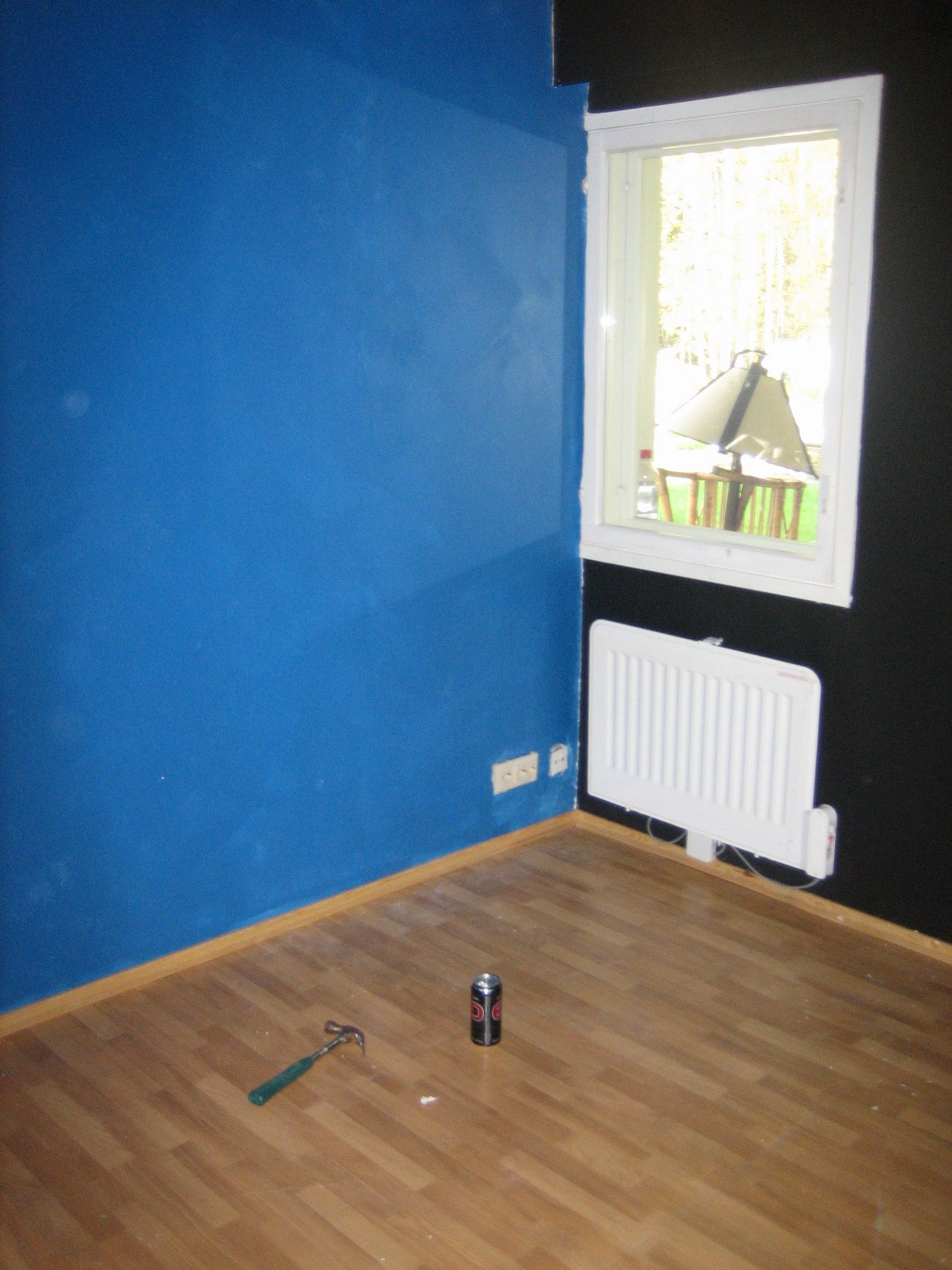 Vanha muovimatto + listat paikoillaan. Matto korvautunee tai päällystyy aikanaan tummalla huovalla. Ehkä.