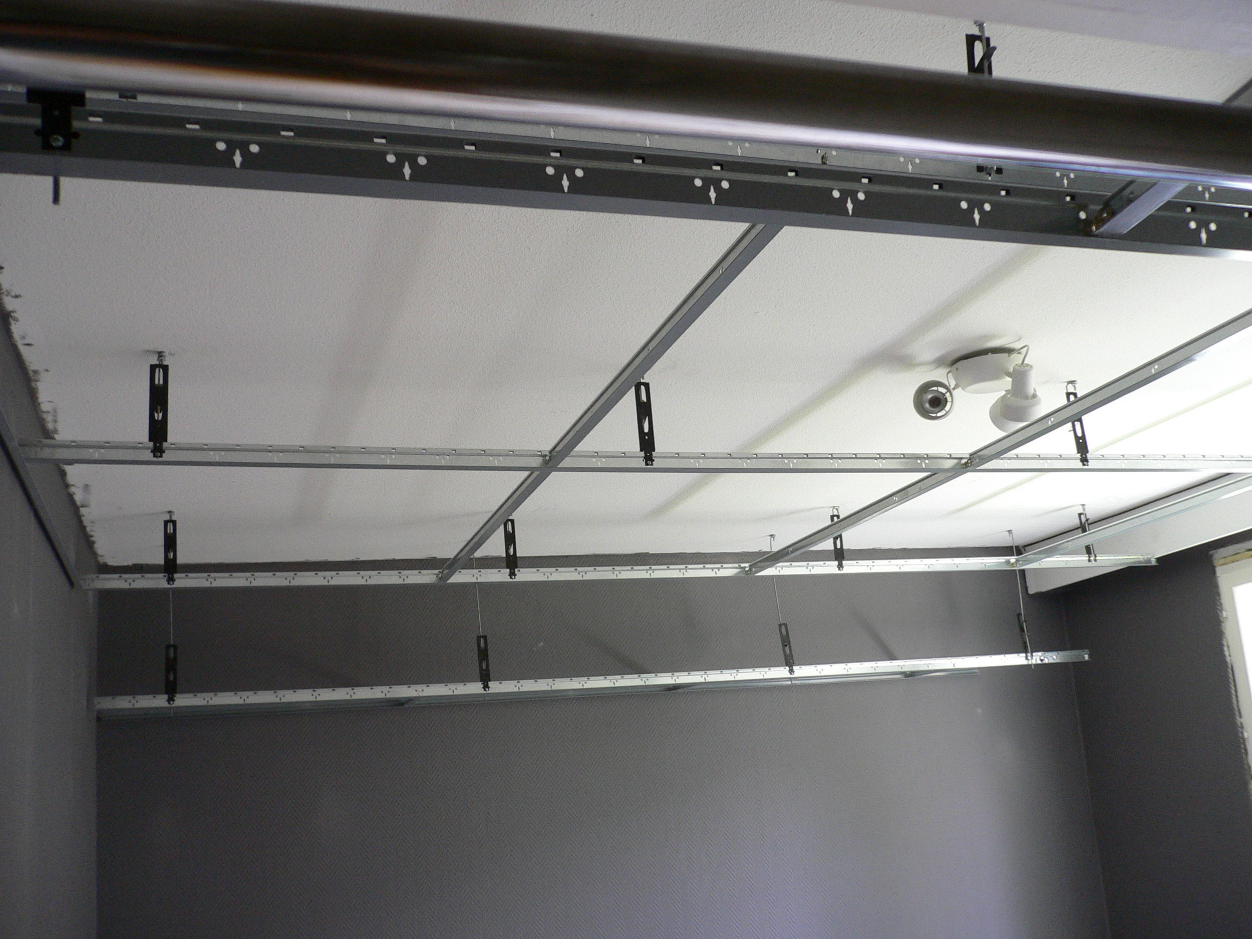 Alakattolistoitus roikkumassa katossa. Listoitus vielä kesken seinien varjolistojen ja vinojen ositon kohdalta.