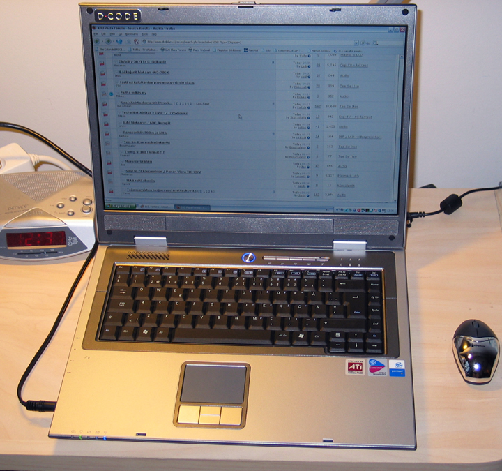 -Asus pohjainen -15,4 "; ATI Mobility Radeon 9700; 64 MB -2,6 Kg (ilmeisesti ilman akkua, koska ei tämä aivan niin kevyeltä tunnu); käyttöaika mukavan pitkä -Intel Pentium M725 (1,6 GHz Centrino) -768 MB (Green) -40 GB, 5400 rpm (Hitachi) -DVD+-RW/CD-RW -Intel WLAN 802.11 g; sisäinen 56k modeemi, Gigabit ethernet -4 x USB2.0; 1 x Firewire; porttitoistin; RJ-11; RJ-45; kortinlukija; 1 x PCMCIA I/II; line in/out -WIN XP PRO (Fin)
