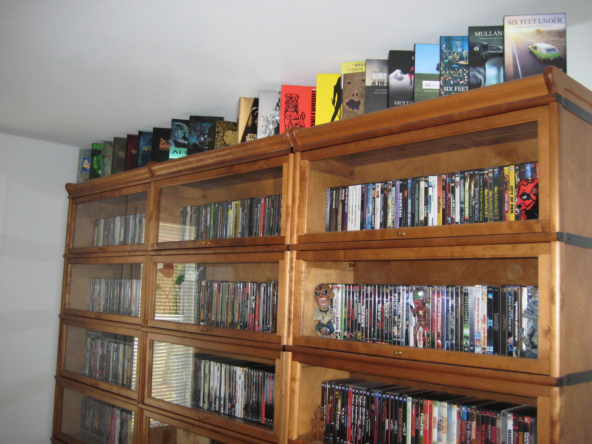 Kirjahyllyn yläpuolella osa box:eista.
