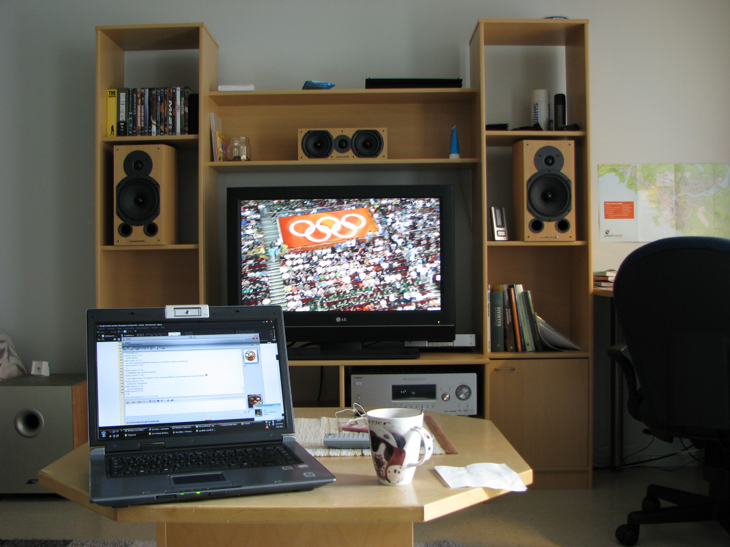 Hyllystö Sotkan Mondo pyökin värisenä kuten kaiuttimetkin, sohvapöytä haettu kympillä Punaisen ristin kontista. Sohva Sotkan Brazil 3-istuttava.