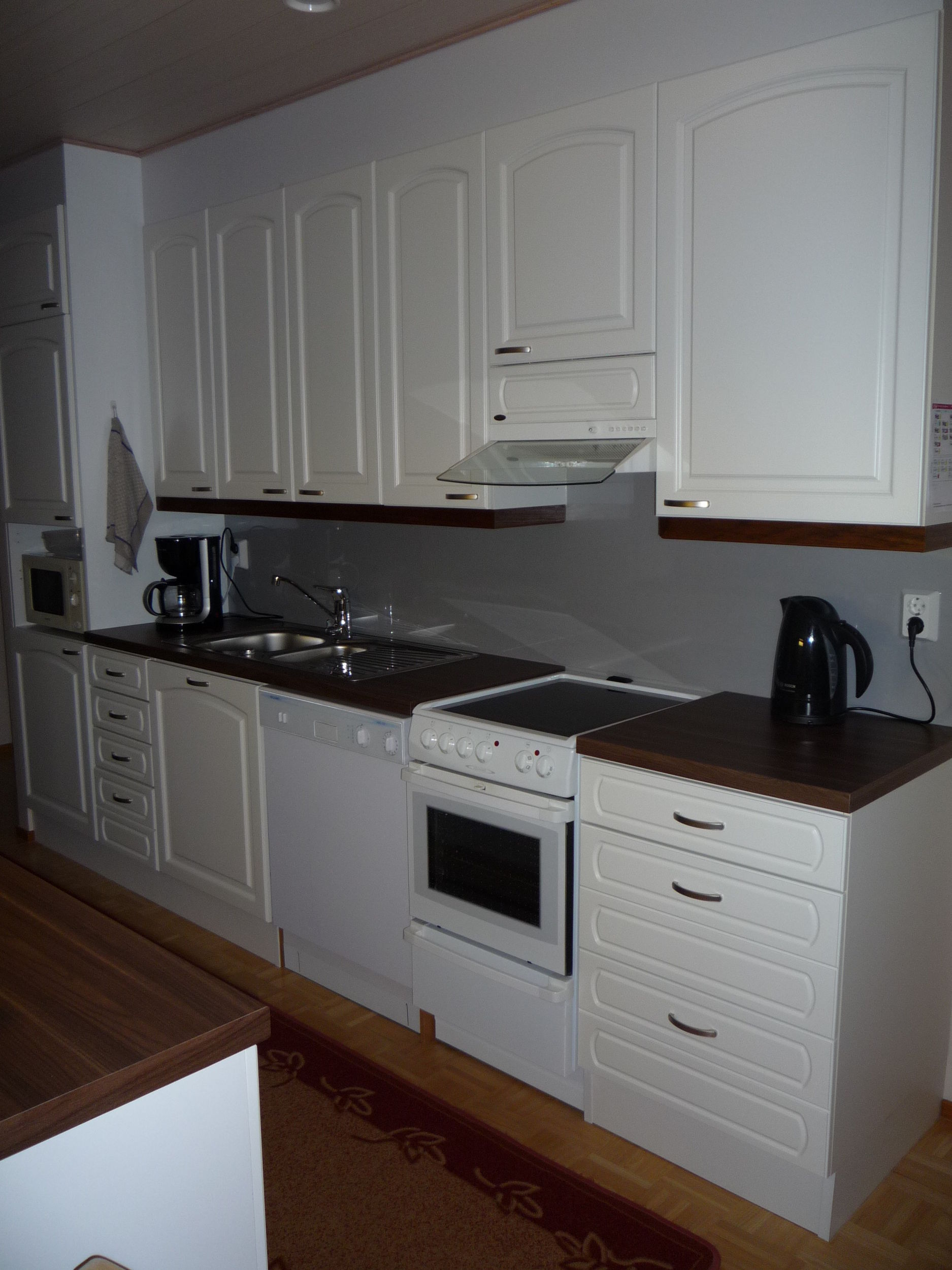 Uusi keittiö. Ovet maalattu, tasot ja allas vaihdettu. Välitilan laatat päällystetty 3 mm laminaatilla.