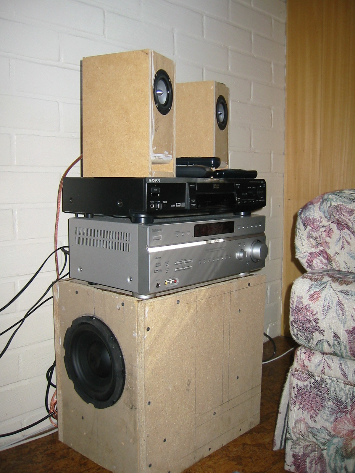 koekuuntelu laitteisto alla tuo lattialevystä tehty W8-subbari. Perheen nuorempi "asentaja" ei voinut vastustaa kiusausta painaa pölysuojaa lommolle.. EDIT: kyljestä näkyy "peilikuvana" pöntön rakenne sekä saumoihin "valettu" epoksi.