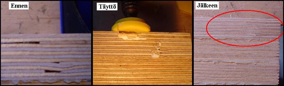Useasti vanerissa on reunavajautta, etenkin levyn uumenissa. Koivuviilusta leikataan sopivan kokoinen pala ja kiilataan se liiman kera koloon. Loppu tulos puhukoot puolestaan. Voidaan tarvittaessa käyttää myös puristusta.