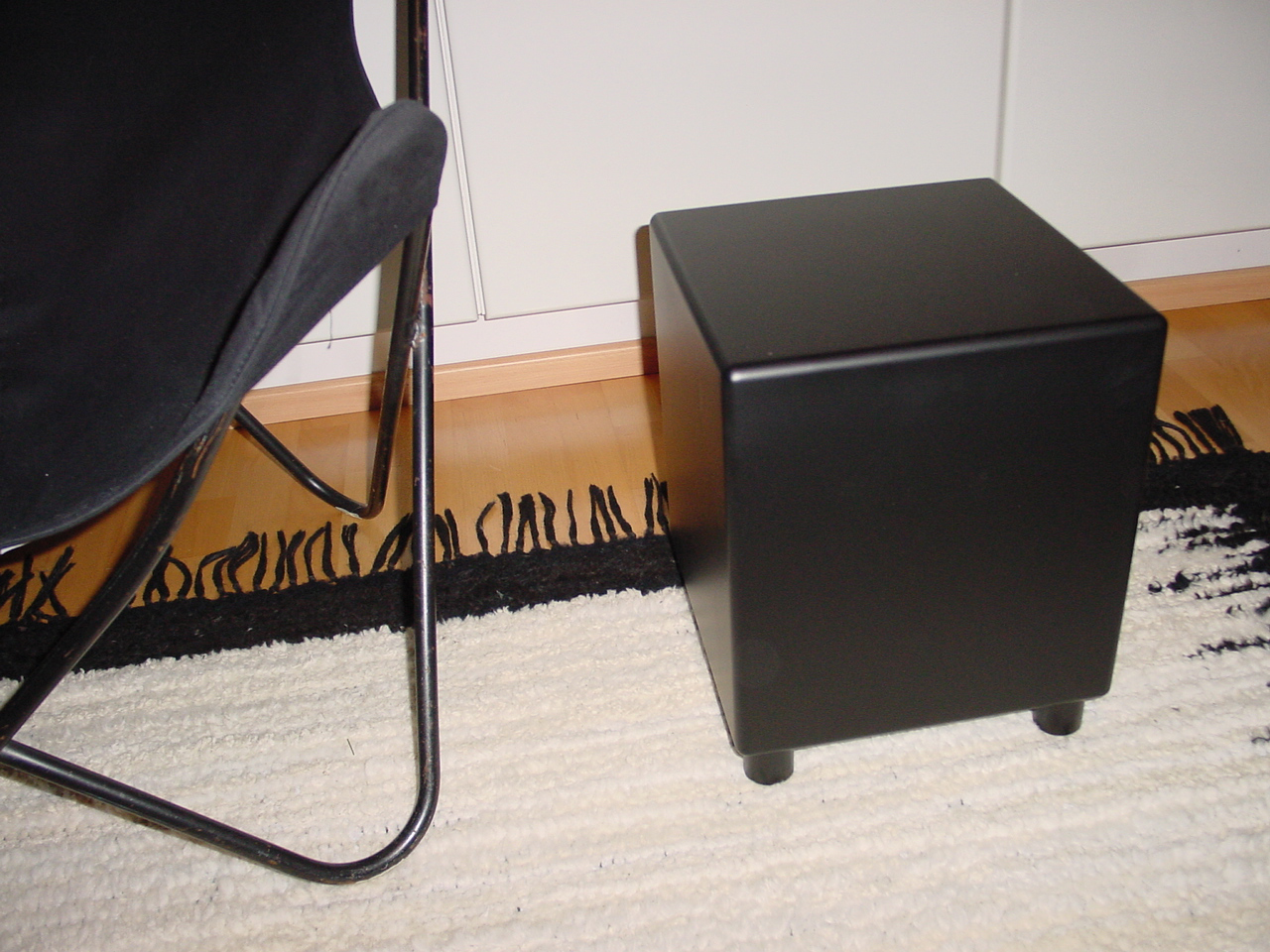 Tässä taidekuva. Subbari ei normaalisti ole keskellä huonetta koristeena ilman johtoja ;) Lepakkotuolin runko on vuodelta 1964 ja kangas on pari vuotta vanha.