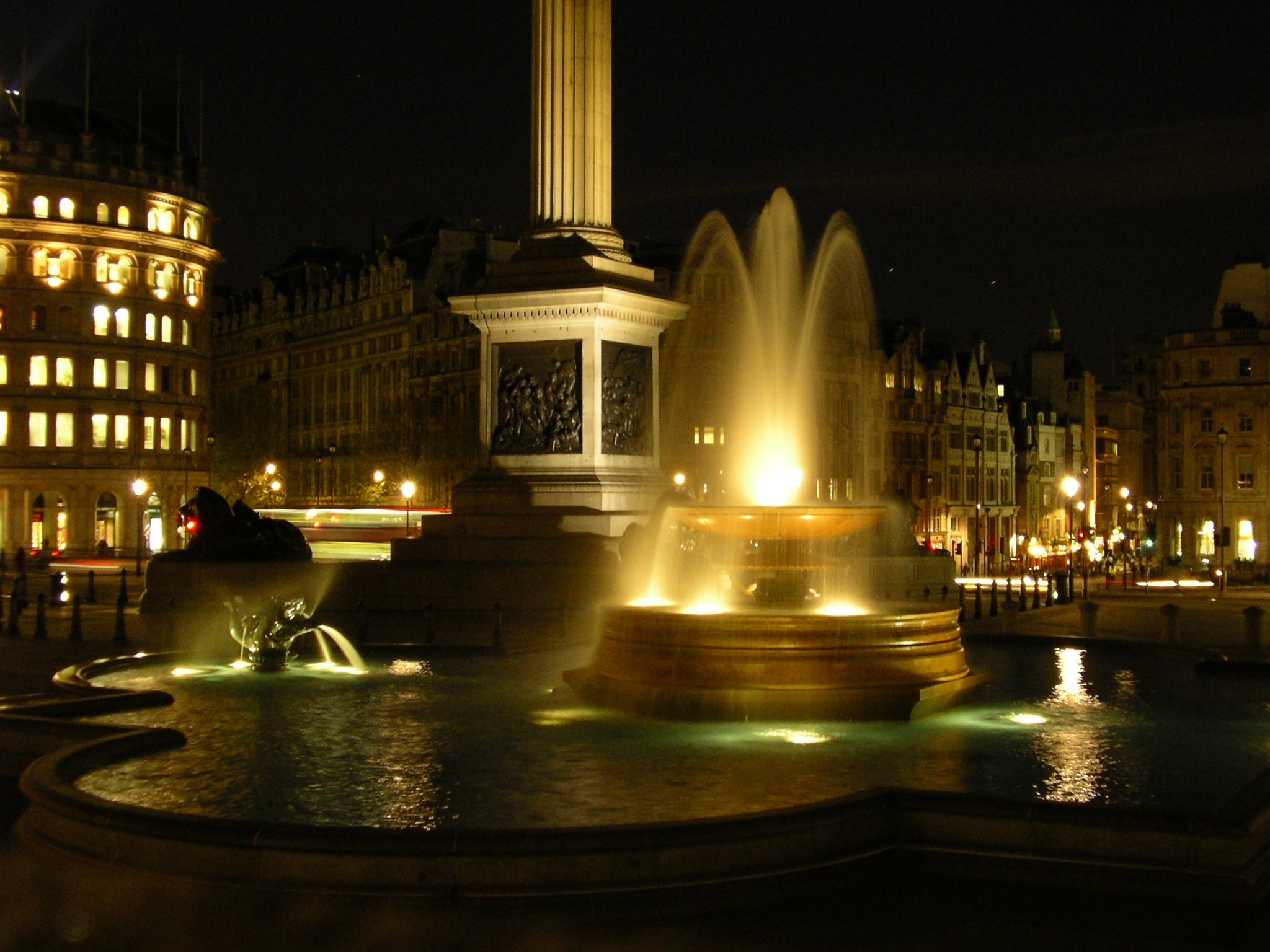 Trafalgar Square ja suihkulähteet iltavaloissa.