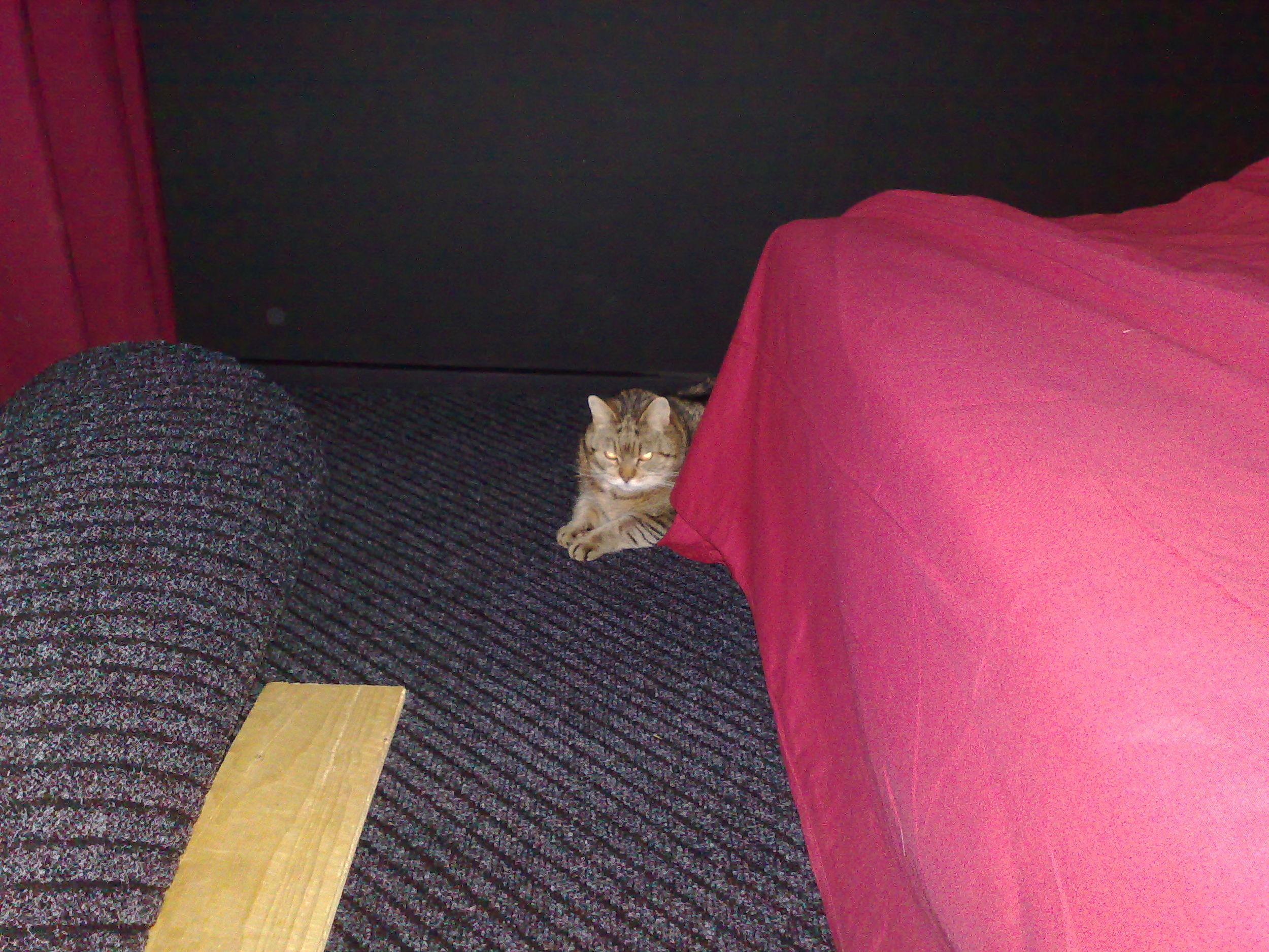 Kumipohjaista kuramattoa Prismasta (100 cm leveä, 8,5 e/m), laitettu vanhan vinyylimaton päälle. Saumakohdissa kaksipuolista teippiä. Siisti tuli ja taas hälyäänet vaimeni, ainakin omasta mielestä. Kissa kävi tarkistamassa asennustyön jälkeä...