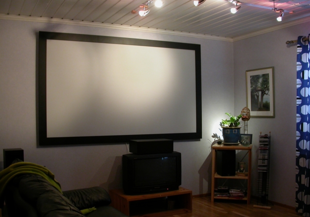 Omatekoinen "Harmony X073 MDF" -valkokangas. Muotosuhde: 16:9 Hyötypinta-ala: n. 215x120 cm