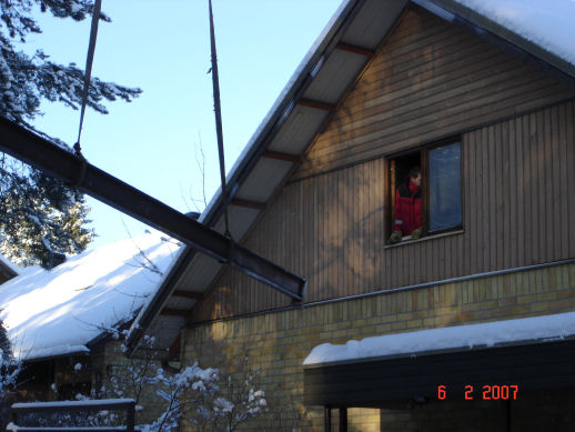 pari 6 metristä teräspalkkia ikkunasta sisään.