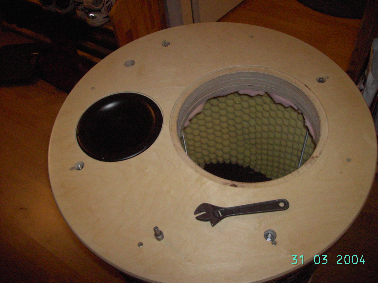 Kotelo jalkaa aja elementtiä vaille valmis. Vasemmassa yläkulmassa oleva "ylimääräinen" reikä on speakon läpivientiä varten.