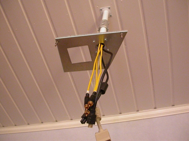 Omatekoinen teline: kaksi kalustejalkaa kiinni toisissaan alumiinimuhvin avulla. Projektori kiinni teräslevyssä, jossa reikä johtojen läpivientiä sekä puhdistusluukun avausta varten. Levyssä olevat ruuvinreiät soikeat, jotta projektorin saa käännetyksi suoraan.
