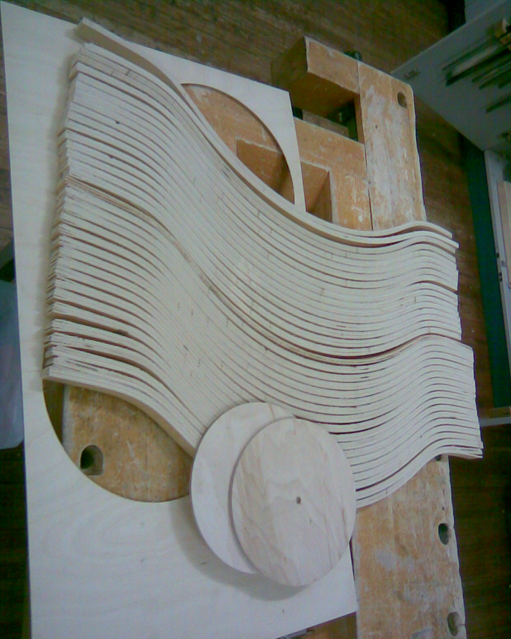 80cm käyrää levyä 2cm suikailena ja pari halkaisijaltaan 19cm ja paksuudeltaan 4mm vanerikiekkoa.