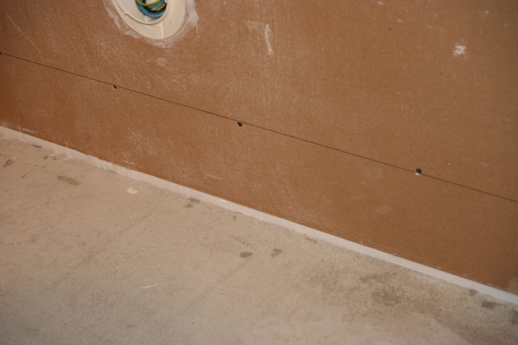 Seinän ja lattian väli tiivistetään elastisella massalla, ettei pääse äänet karkaamaan sitä kautta, sama tehdään kaikille muillekkin saumoille, eli elastista massaa menee monta laatikkoa!