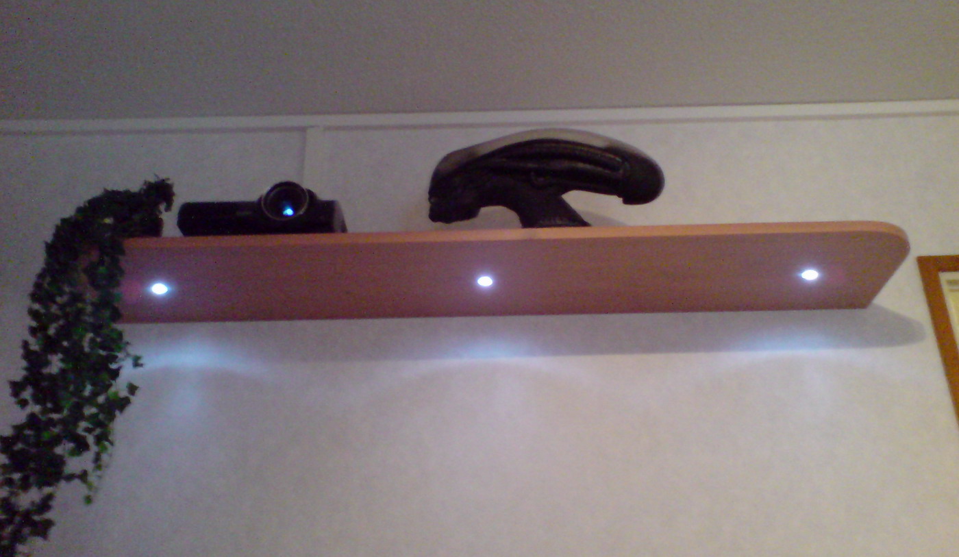 Hyllyyn asennettu "ledihalogeenit" jotka ovat kirkaudeltaan sopivat, eivät valaise liikaa joten kuva säilyy hyvänä mutta ihan pimeässäkään ei tarvitse kompuroida =)