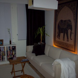 Sohva on ~25cm seinästä irti ja kuuntelijasta on noin 55cm takaseinään.