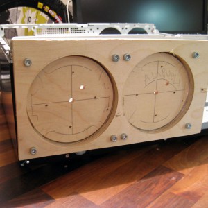 Tuuletinreikien suurentaminen menossa. Koteloa tukemaan tehty sandwich-tyylinen kaksipuolinen tukilevy reikäsahausta varten.