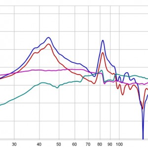 Tässä pieni kuva josta voi ihmetellä suurten kaiuttimien ongelmia... [IMG] Sininen käyrä on refleksiputket auki kuuntelupaikalta. Punainen putket...